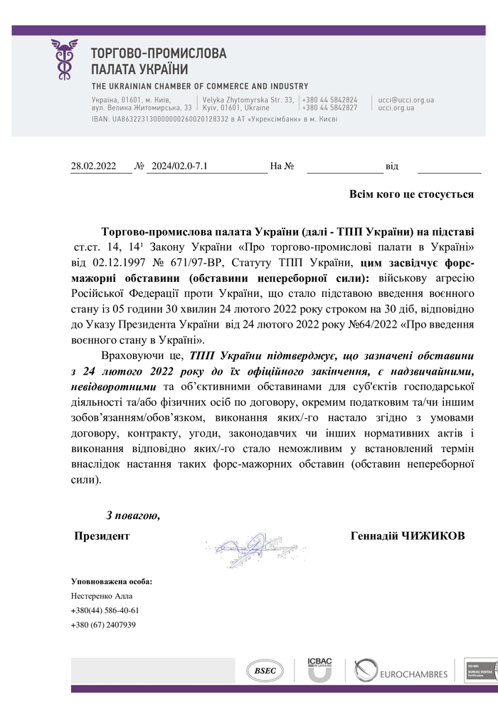 ТПП України листом від 28.02.2022 №2024/02.0-7.1 засвідчила, що військова агресія РФ проти України стала підставою для введення воєнного стану та є форс-мажорними обставинами (обставинами непереборної сили).